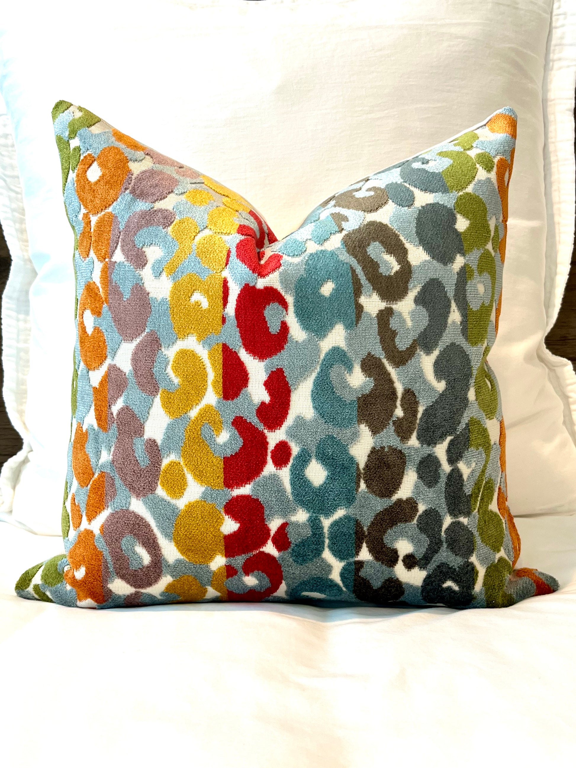 Statement making animal print pillow cover. Features interchanging chenille leopard spots in a variety of bold colors - green, sea glass, blue, orange, gray, purple and red.
