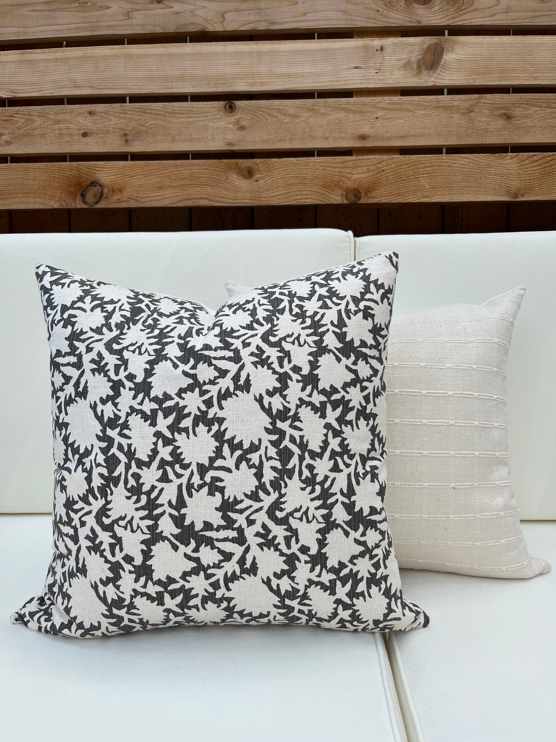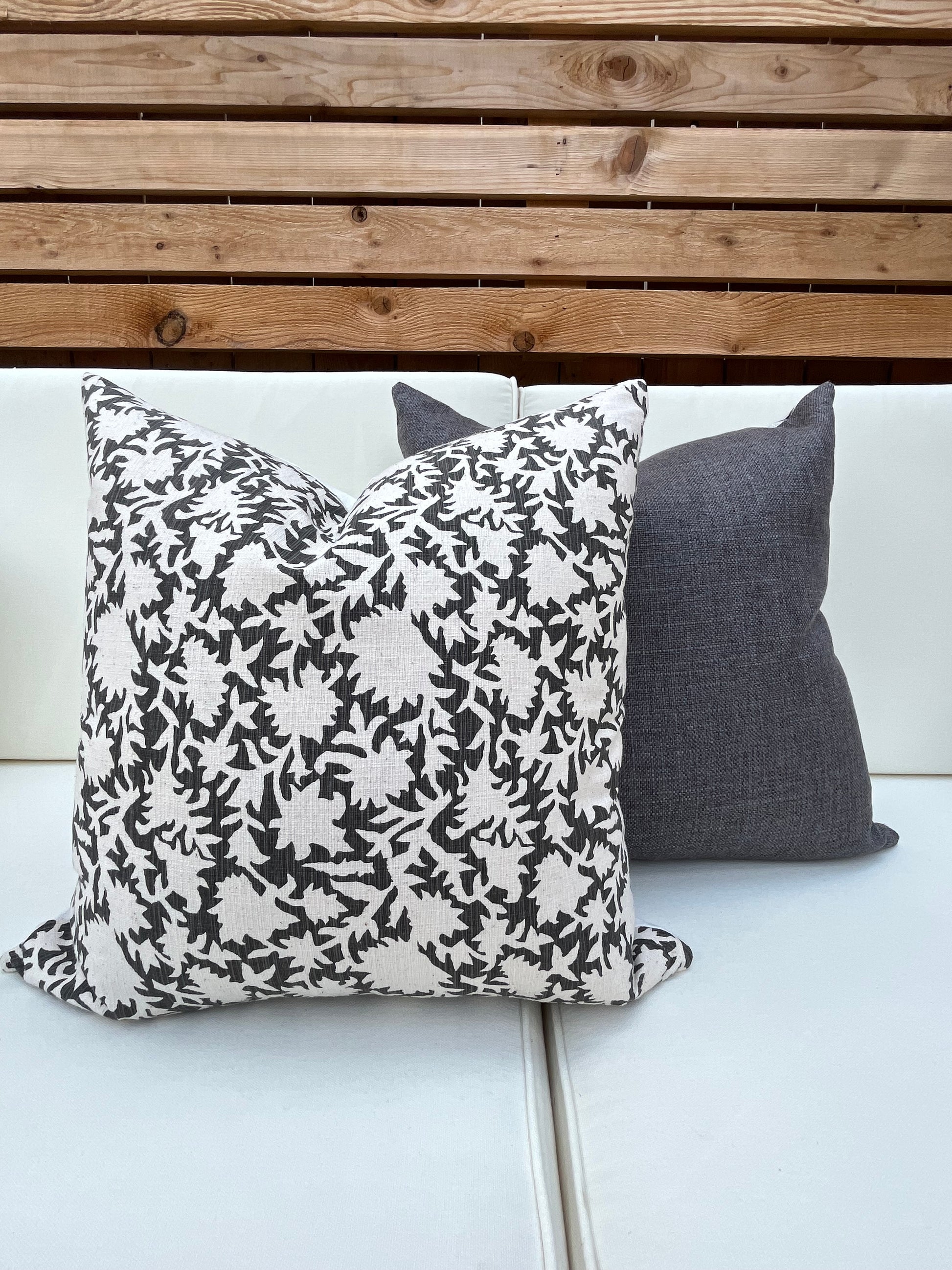 The Nantucket pillow cover features a dark gray background with beige floral block print. This beautiful natural cotton pillow will add a perfect feminine flare to your space.