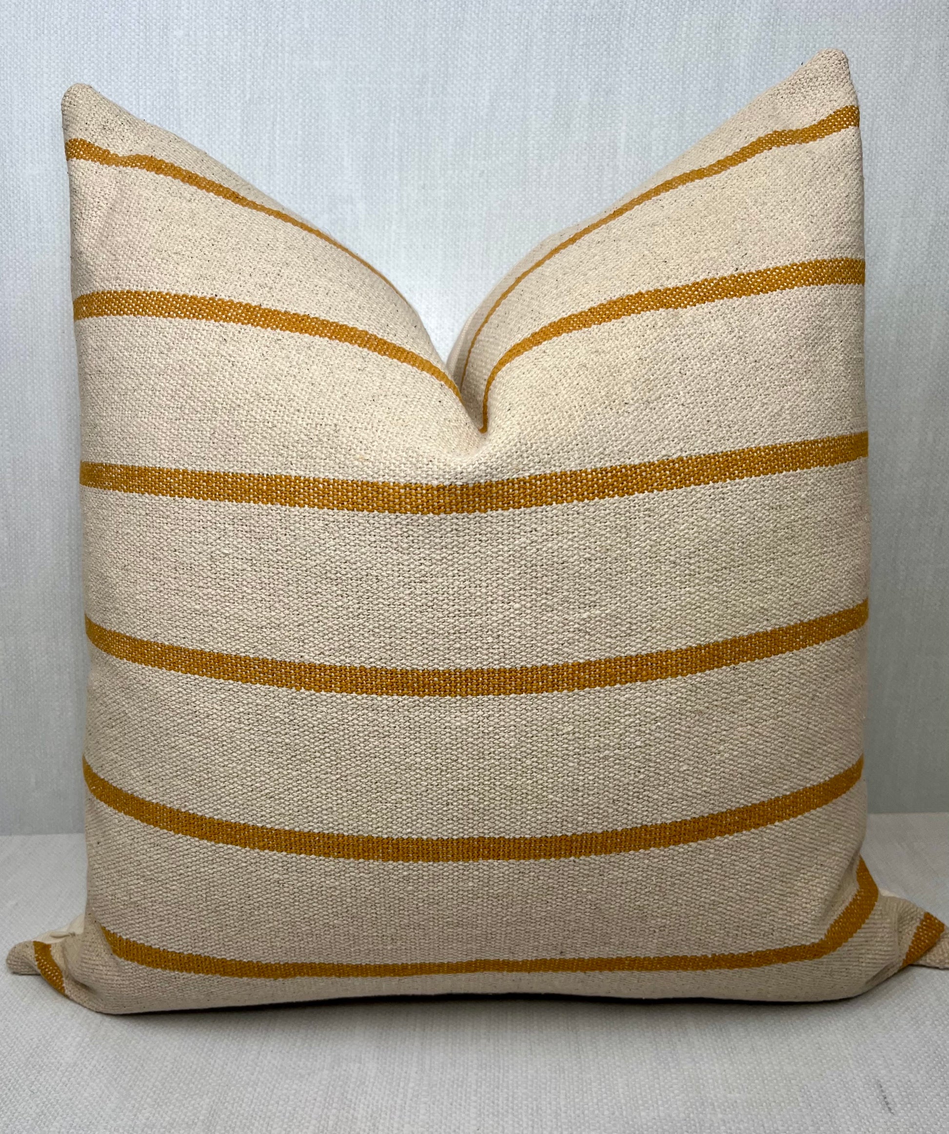 This classic striped pillow cover features a muted mustard yellow on a creamy beige background, adding the perfect pop of color to any space. Crafted from beautiful striped grain sack French cotton fabric, it offers a timeless and charming accent.