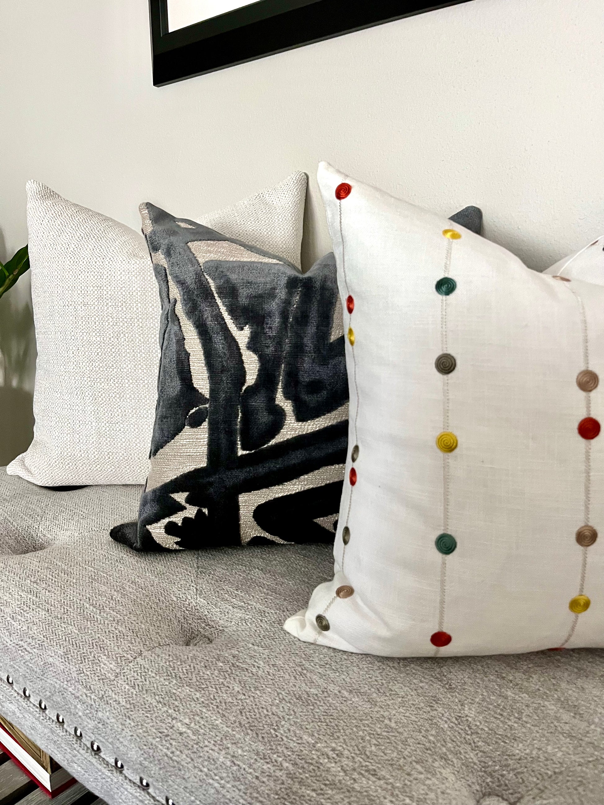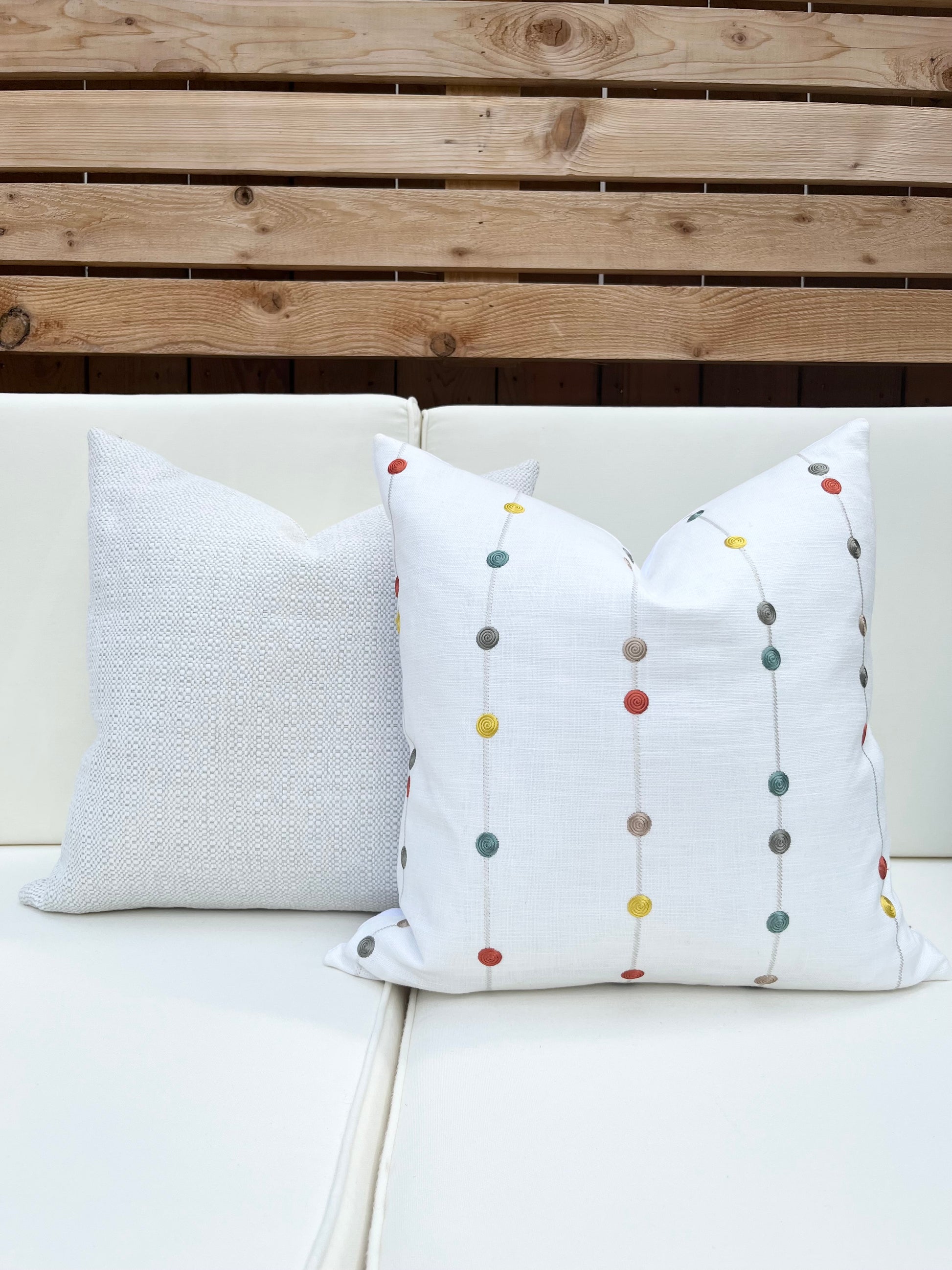 Soft and textural pillow cover. This woven fabric with colorful embroidered lines and dots against a white background is very at home with other neutrals.