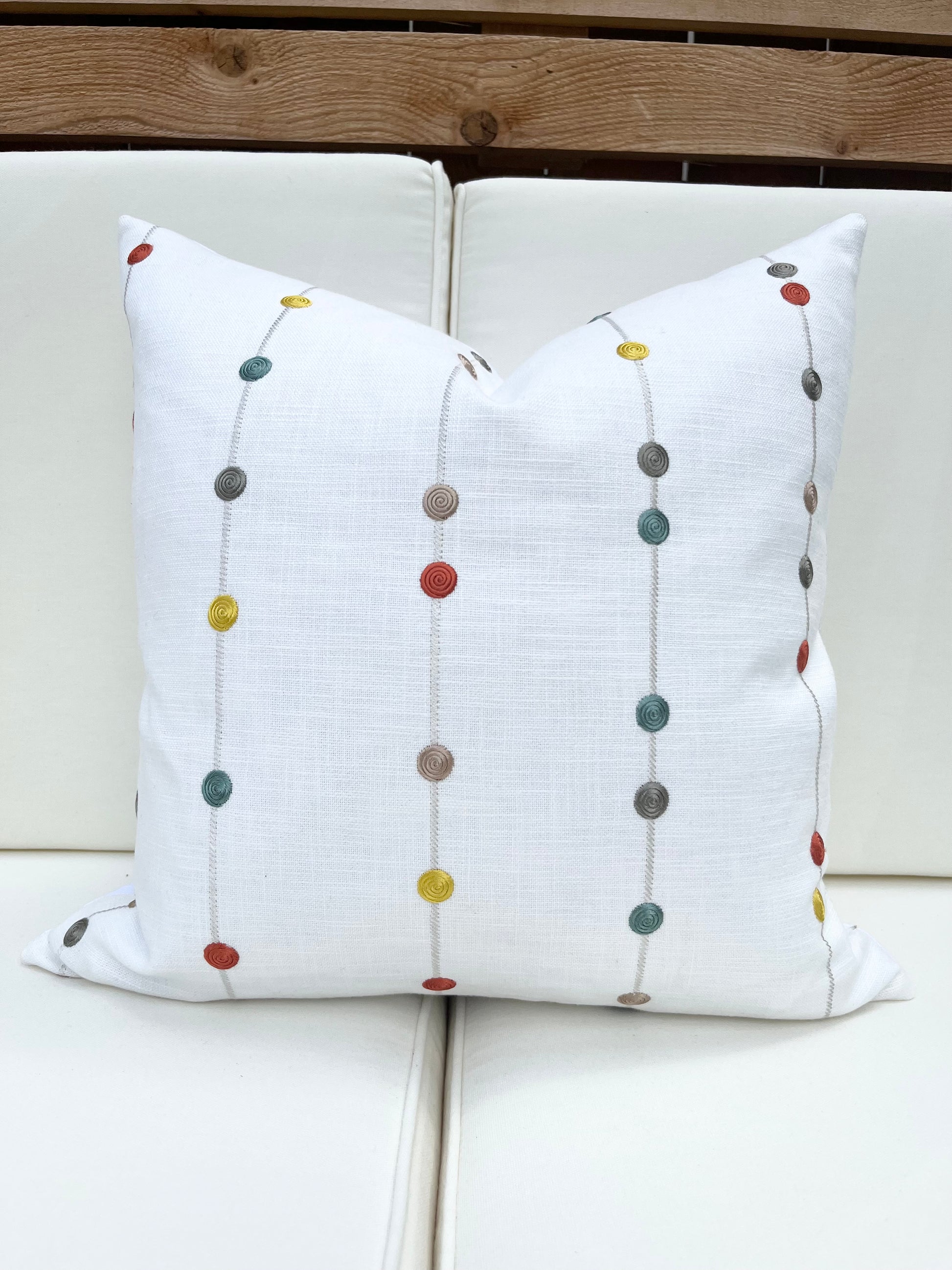 Kenley White Decorative Pillow Cover with Colorful Embroidered Stripes and Dots