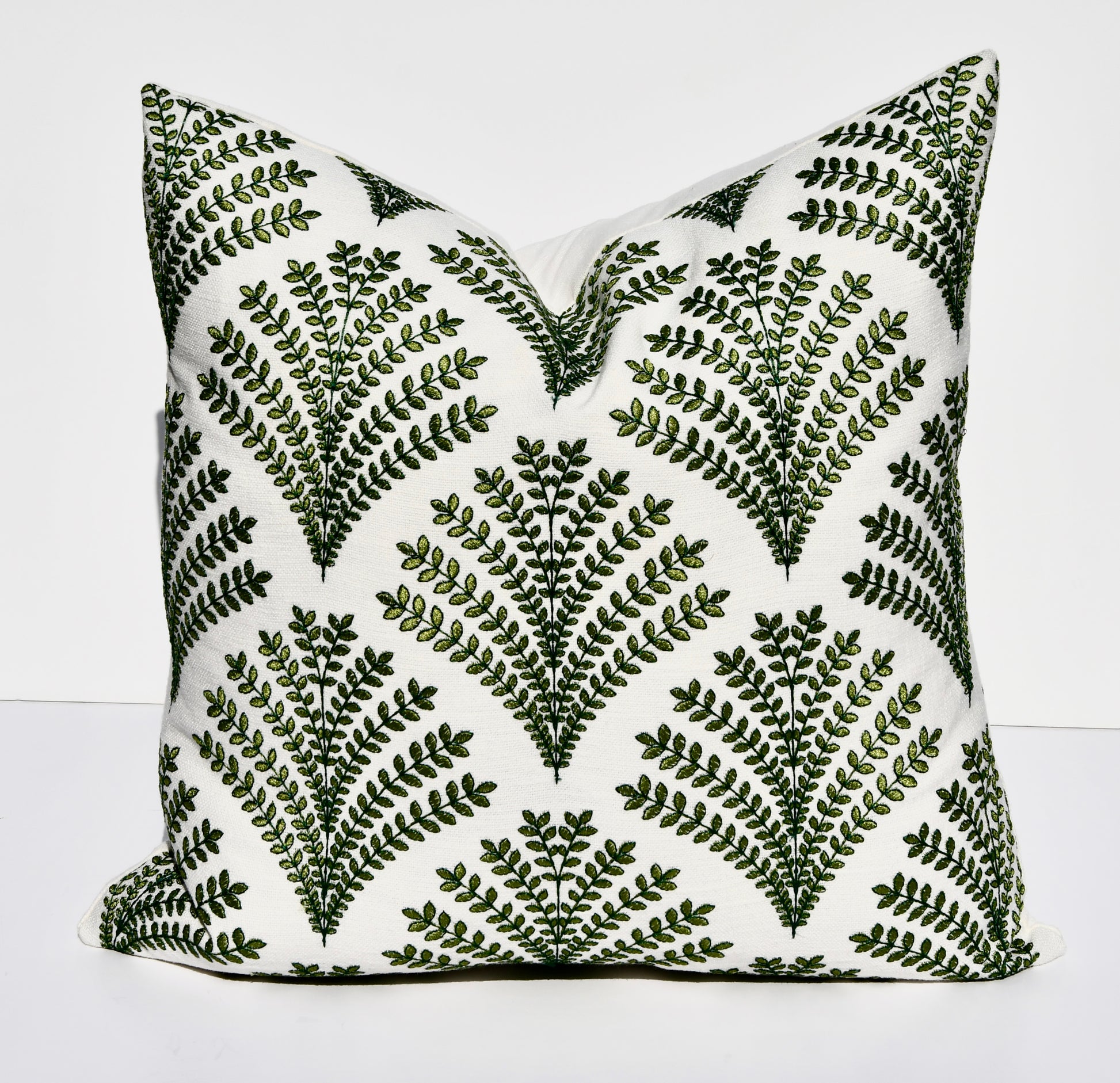 Olivia Green and White Fern Embroidered Throw Pillow Covers