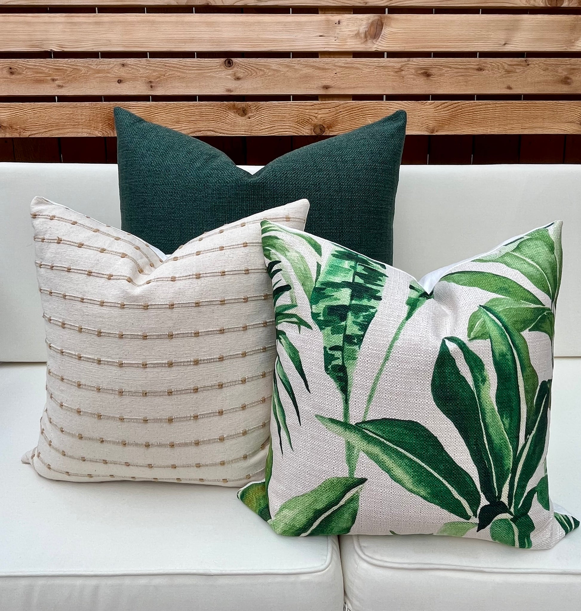 This beautiful pillow features tropical leaves and palms in shades of green. You'll be swept away by these lush leaves. Add this green pillow to any room and bring a cool and friendly atmosphere along with it. The color green will also add a touch of the outdoors to any living space as well as adding elegance and charm.