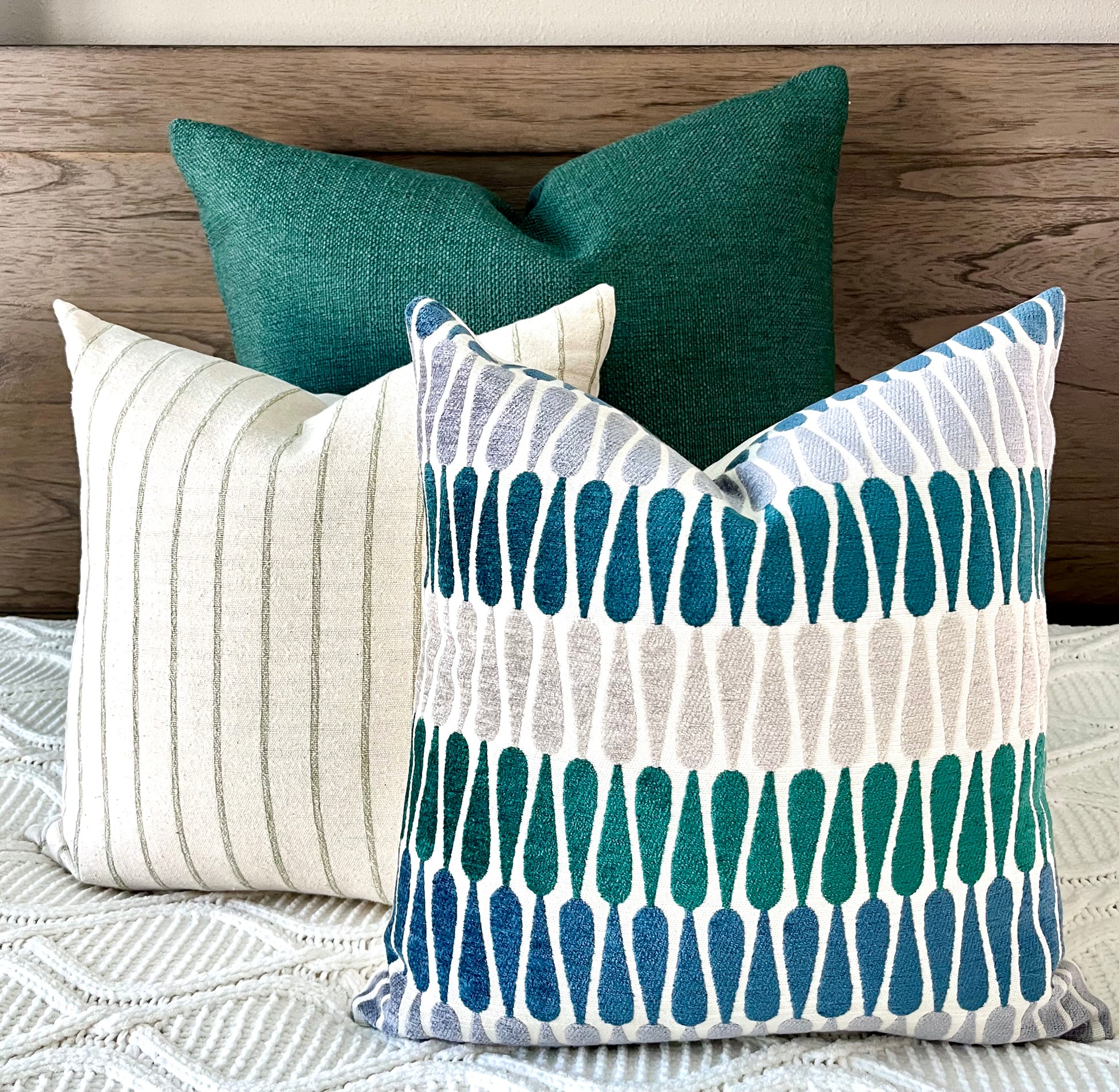 The Willow pillow cover features a subtle beige background with olive green woven stripes. Perfect neutral for any space.